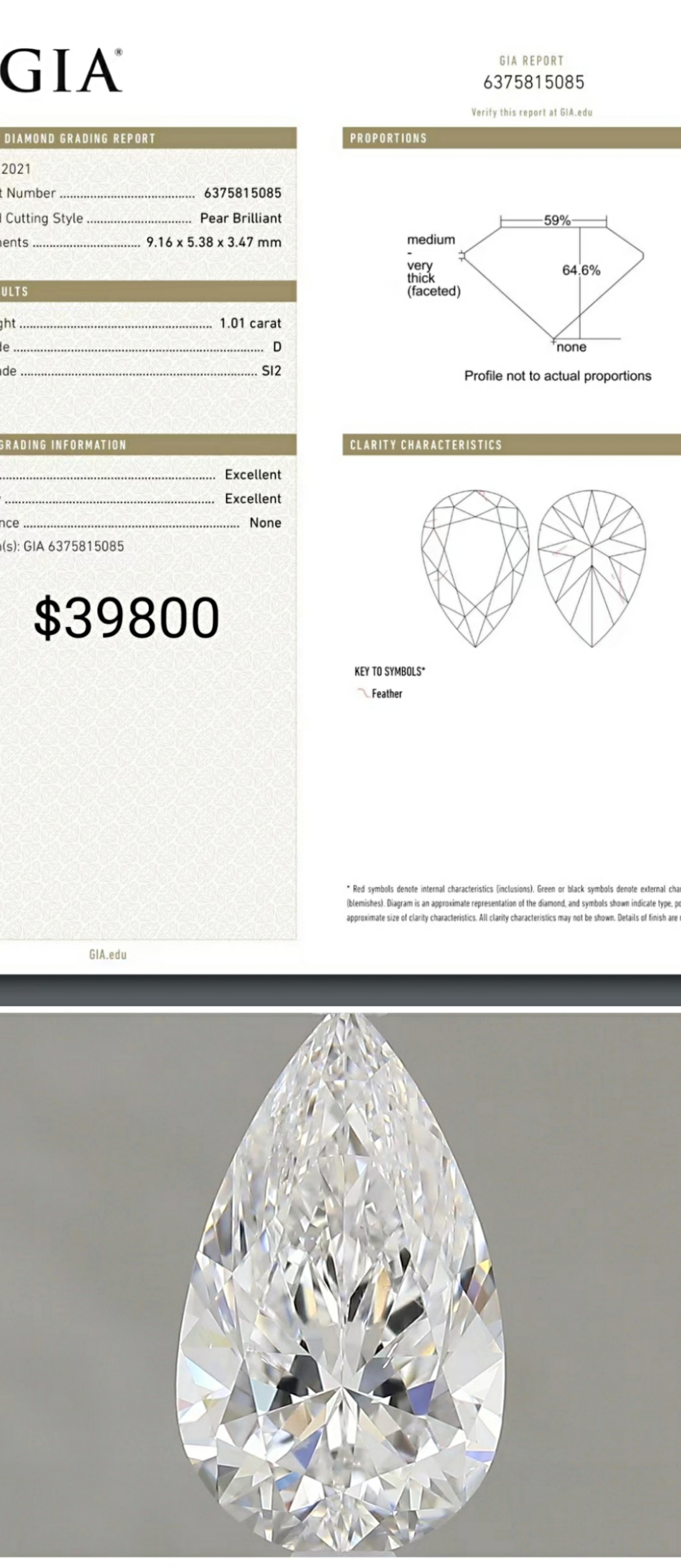 1.01ct D SI2 GIA6375815085